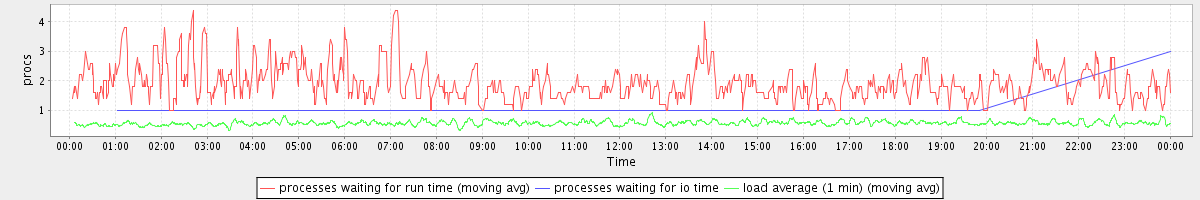 avg(processes waiting for run time) = 0.75 avg(processes waiting for io time) = 0.01 avg(load average (1 min)) = 0.57