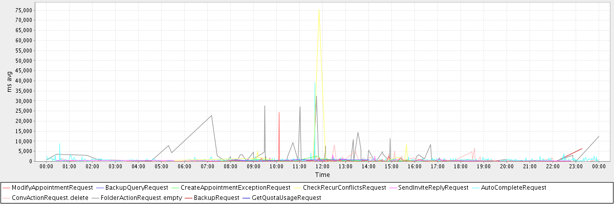 avg(ModifyAppointmentRequest) = 371.64 avg(BackupQueryRequest) = 489.80 avg(CreateAppointmentExceptionRequest) = 419.21 avg(CheckRecurConflictsRequest) = 3872.68 avg(SendInviteReplyRequest) = 462.67 avg(AutoCompleteRequest) = 585.54 avg(ConvActionRequest.delete) = 735.38 avg(FolderActionRequest.empty) = 2970.37 avg(BackupRequest) = 3541.00 avg(GetQuotaUsageRequest) = 1441.00