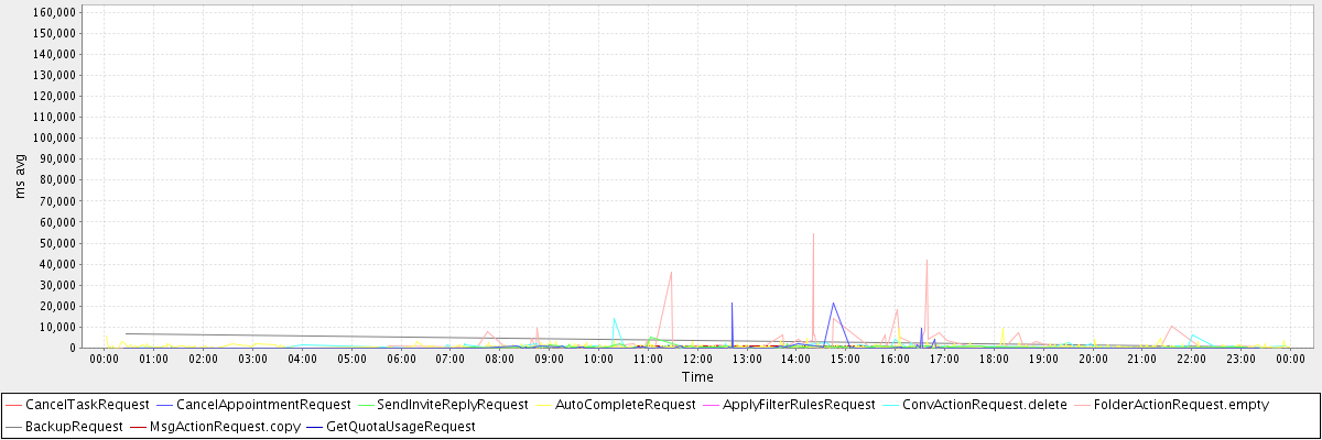 avg(CancelTaskRequest) = 805.00 avg(CancelAppointmentRequest) = 765.28 avg(SendInviteReplyRequest) = 592.38 avg(AutoCompleteRequest) = 654.47 avg(ApplyFilterRulesRequest) = 155939.00 avg(ConvActionRequest.delete) = 803.70 avg(FolderActionRequest.empty) = 3421.80 avg(BackupRequest) = 3470.50 avg(MsgActionRequest.copy) = 815.67 avg(GetQuotaUsageRequest) = 1411.00