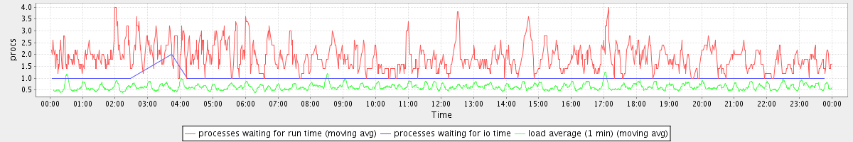 avg(processes waiting for run time) = 0.76 avg(processes waiting for io time) = 0.01 avg(load average (1 min)) = 0.64