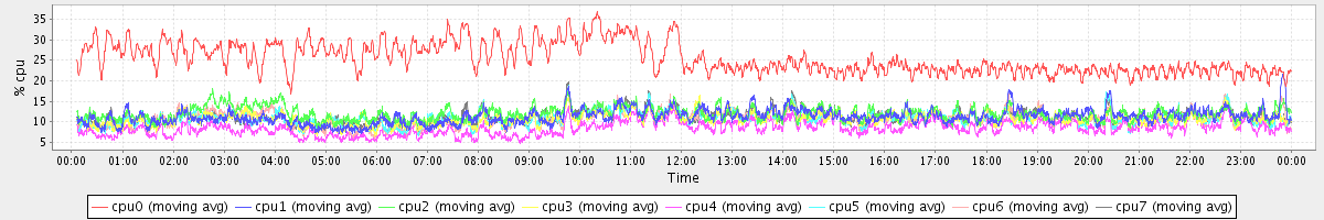 avg(cpu0) = 25.44 avg(cpu1) = 11.22 avg(cpu2) = 11.97 avg(cpu3) = 10.74 avg(cpu4) = 8.39 avg(cpu5) = 10.83 avg(cpu6) = 10.79 avg(cpu7) = 11.11