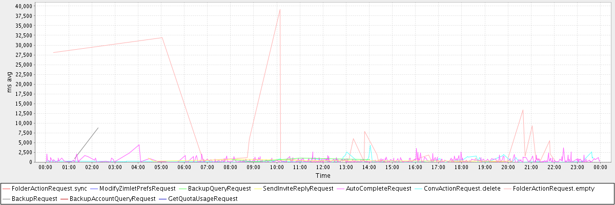 avg(FolderActionRequest.sync) = 498.00 avg(ModifyZimletPrefsRequest) = 448.00 avg(BackupQueryRequest) = 530.20 avg(SendInviteReplyRequest) = 482.62 avg(AutoCompleteRequest) = 466.69 avg(ConvActionRequest.delete) = 533.92 avg(FolderActionRequest.empty) = 3950.07 avg(BackupRequest) = 4826.00 avg(BackupAccountQueryRequest) = 652.00 avg(GetQuotaUsageRequest) = 898.00