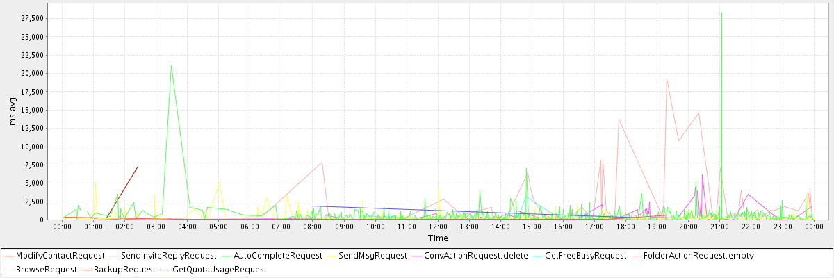 avg(ModifyContactRequest) = 320.75 avg(SendInviteReplyRequest) = 785.00 avg(AutoCompleteRequest) = 625.06 avg(SendMsgRequest) = 255.21 avg(ConvActionRequest.delete) = 737.11 avg(GetFreeBusyRequest) = 388.77 avg(FolderActionRequest.empty) = 2289.06 avg(BrowseRequest) = 798.00 avg(BackupRequest) = 3796.00 avg(GetQuotaUsageRequest) = 767.00