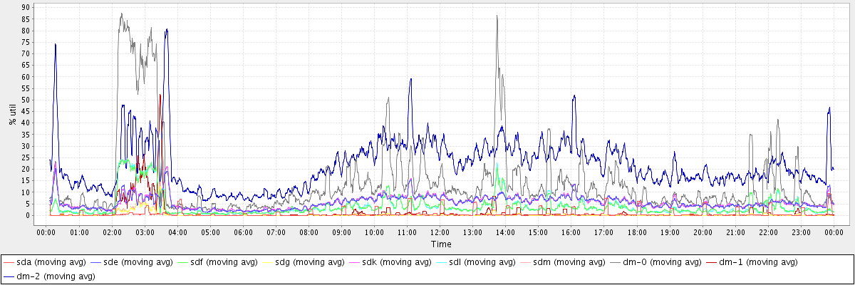 avg(sda) = 0.67 avg(sde) = 5.56 avg(sdf) = 3.89 avg(sdg) = 0.32 avg(sdk) = 5.70 avg(sdl) = 3.95 avg(sdm) = 0.36 avg(dm-0) = 14.44 avg(dm-1) = 1.30 avg(dm-2) = 21.70