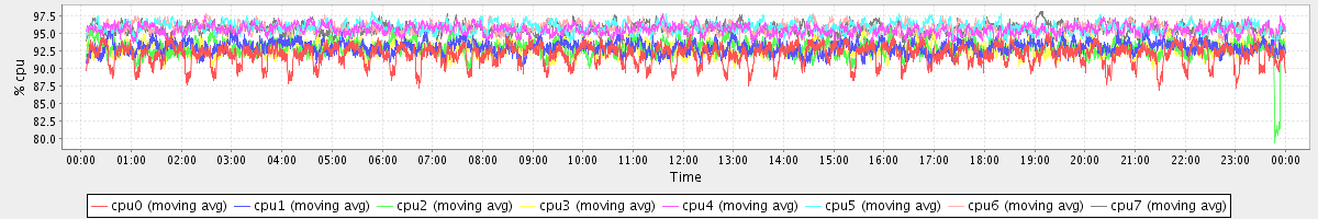 avg(cpu0) = 92.00 avg(cpu1) = 93.04 avg(cpu2) = 92.92 avg(cpu3) = 92.82 avg(cpu4) = 95.55 avg(cpu5) = 95.83 avg(cpu6) = 95.73 avg(cpu7) = 95.66