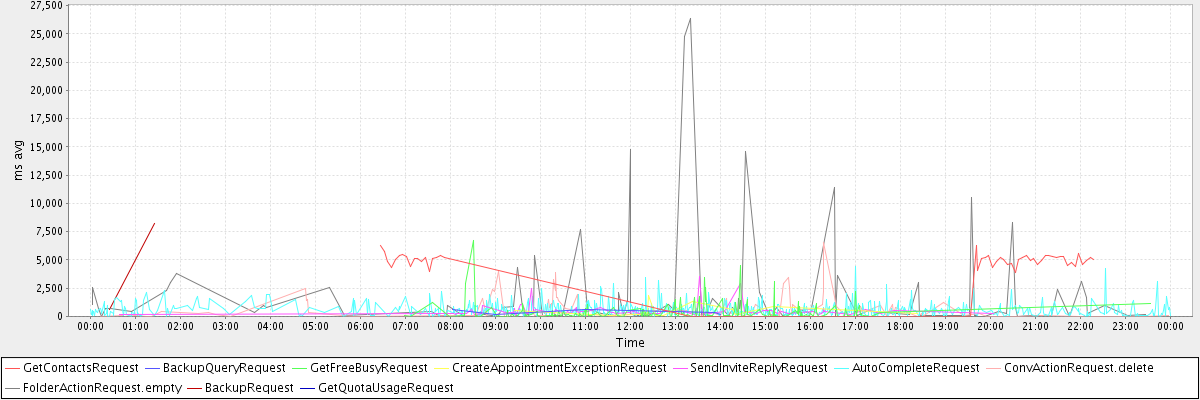 avg(GetContactsRequest) = 2990.98 avg(BackupQueryRequest) = 350.50 avg(GetFreeBusyRequest) = 382.37 avg(CreateAppointmentExceptionRequest) = 434.82 avg(SendInviteReplyRequest) = 490.67 avg(AutoCompleteRequest) = 581.01 avg(ConvActionRequest.delete) = 778.10 avg(FolderActionRequest.empty) = 1793.10 avg(BackupRequest) = 4436.50 avg(GetQuotaUsageRequest) = 905.00