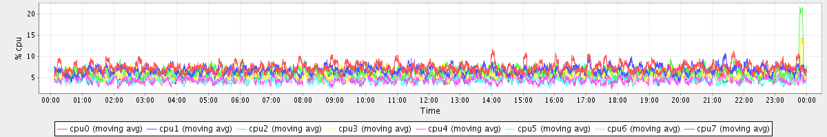 avg(cpu0) = 7.31 avg(cpu1) = 6.74 avg(cpu2) = 6.45 avg(cpu3) = 6.06 avg(cpu4) = 4.62 avg(cpu5) = 4.58 avg(cpu6) = 4.94 avg(cpu7) = 5.18