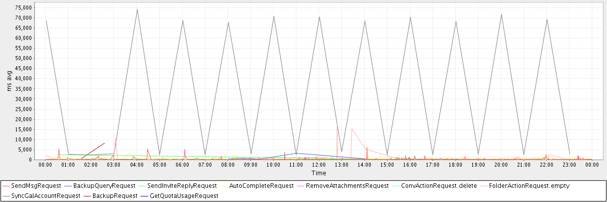 avg(SendMsgRequest) = 249.37 avg(BackupQueryRequest) = 1111.60 avg(SendInviteReplyRequest) = 751.29 avg(AutoCompleteRequest) = 446.64 avg(RemoveAttachmentsRequest) = 426.25 avg(ConvActionRequest.delete) = 265.35 avg(FolderActionRequest.empty) = 1912.72 avg(SyncGalAccountRequest) = 33503.67 avg(BackupRequest) = 4465.50 avg(GetQuotaUsageRequest) = 994.00