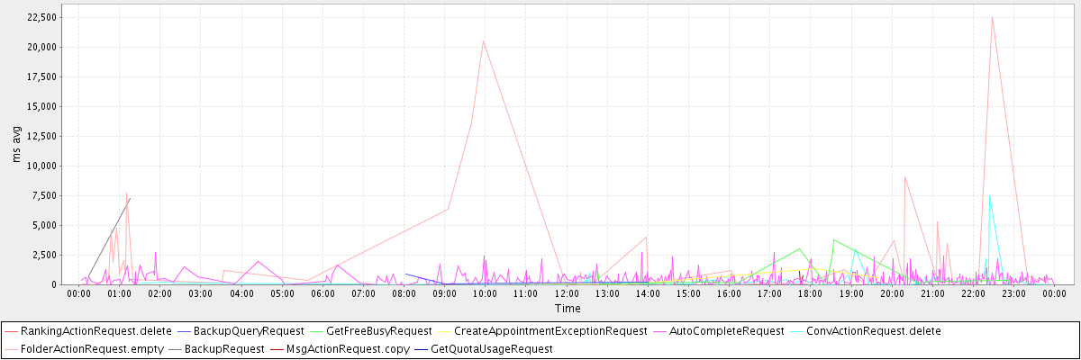 avg(RankingActionRequest.delete) = 411.00 avg(BackupQueryRequest) = 328.00 avg(GetFreeBusyRequest) = 819.88 avg(CreateAppointmentExceptionRequest) = 536.00 avg(AutoCompleteRequest) = 453.03 avg(ConvActionRequest.delete) = 357.59 avg(FolderActionRequest.empty) = 2348.95 avg(BackupRequest) = 3972.00 avg(MsgActionRequest.copy) = 657.67 avg(GetQuotaUsageRequest) = 813.00