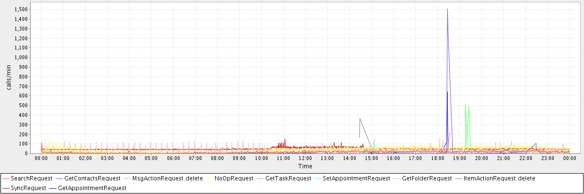 max(SearchRequest) = 110.00 max(GetContactsRequest) = 1504.00 max(MsgActionRequest.delete) = 514.00 max(NoOpRequest) = 157.00 max(GetTaskRequest) = 215.00 max(SetAppointmentRequest) = 137.00 max(GetFolderRequest) = 164.00 max(ItemActionRequest.delete) = 362.00 max(SyncRequest) = 150.00 max(GetAppointmentRequest) = 640.00