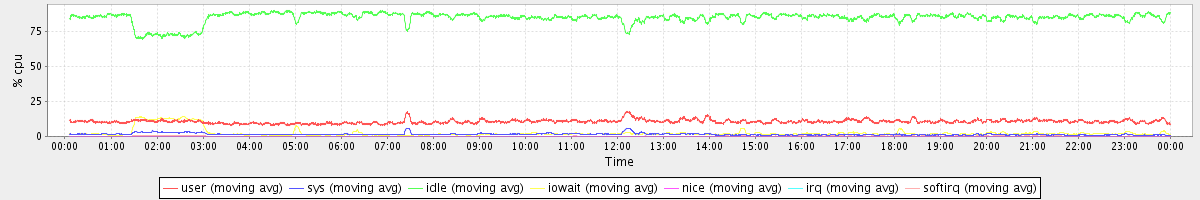 avg(user) = 10.62 avg(sys) = 1.55 avg(idle) = 85.09 avg(iowait) = 2.46 avg(nice) = 0.00 avg(irq) = 0.01 avg(softirq) = 0.27