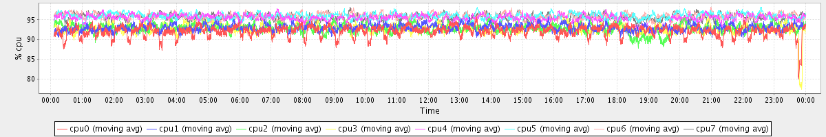 avg(cpu0) = 92.09 avg(cpu1) = 92.99 avg(cpu2) = 92.86 avg(cpu3) = 92.72 avg(cpu4) = 95.41 avg(cpu5) = 95.91 avg(cpu6) = 95.89 avg(cpu7) = 95.63