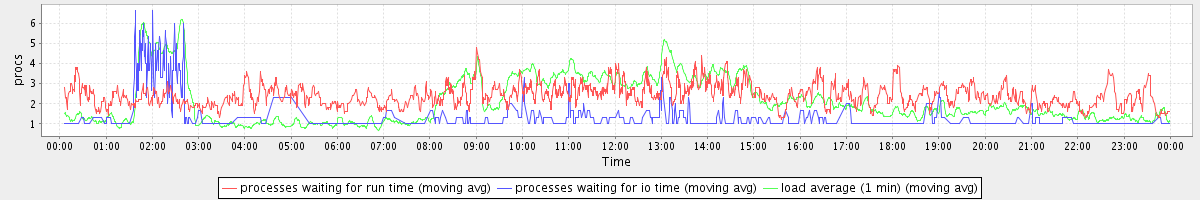avg(processes waiting for run time) = 1.79 avg(processes waiting for io time) = 0.44 avg(load average (1 min)) = 2.12