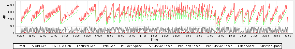 avg(total) = 2936.82 avg(PS Old Gen) = 0.00 avg(CMS Old Gen) = 2367.87 avg(Tenured Gen) = 0.00 avg(Train Gen) = 0.00 avg(PS Eden Space) = 0.00 avg(PS Survivor Space) = 0.00 avg(Par Eden Space) = 480.83 avg(Par Survivor Space) = 88.12 avg(Eden Space) = 0.00 avg(Survivor Space) = 0.00