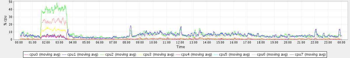avg(cpu0) = 1.29 avg(cpu1) = 0.24 avg(cpu2) = 0.29 avg(cpu3) = 0.20 avg(cpu4) = 0.16 avg(cpu5) = 0.16 avg(cpu6) = 0.21 avg(cpu7) = 0.18