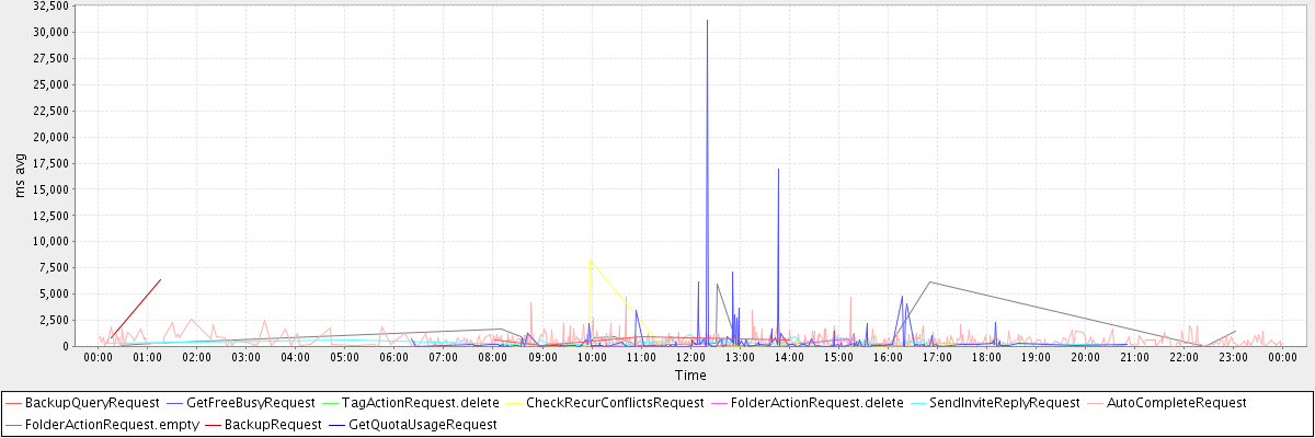 avg(BackupQueryRequest) = 507.40 avg(GetFreeBusyRequest) = 570.88 avg(TagActionRequest.delete) = 1407.00 avg(CheckRecurConflictsRequest) = 402.17 avg(FolderActionRequest.delete) = 349.14 avg(SendInviteReplyRequest) = 415.34 avg(AutoCompleteRequest) = 549.25 avg(FolderActionRequest.empty) = 757.15 avg(BackupRequest) = 3584.00 avg(GetQuotaUsageRequest) = 868.00