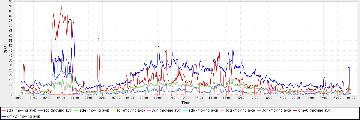 avg(sda) = 0.85 avg(sdc) = 3.87 avg(sde) = 6.47 avg(sdf) = 3.85 avg(sdn) = 6.43 avg(sdo) = 3.84 avg(sdq) = 6.51 avg(sdr) = 3.87 avg(dm-0) = 14.43 avg(dm-2) = 19.00