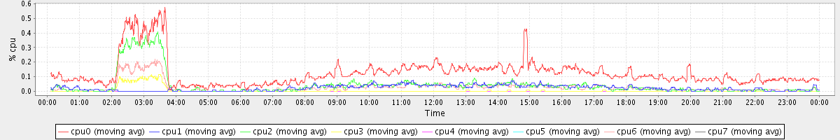 avg(cpu0) = 0.13 avg(cpu1) = 0.02 avg(cpu2) = 0.04 avg(cpu3) = 0.01 avg(cpu4) = 0.00 avg(cpu5) = 0.00 avg(cpu6) = 0.03 avg(cpu7) = 0.00
