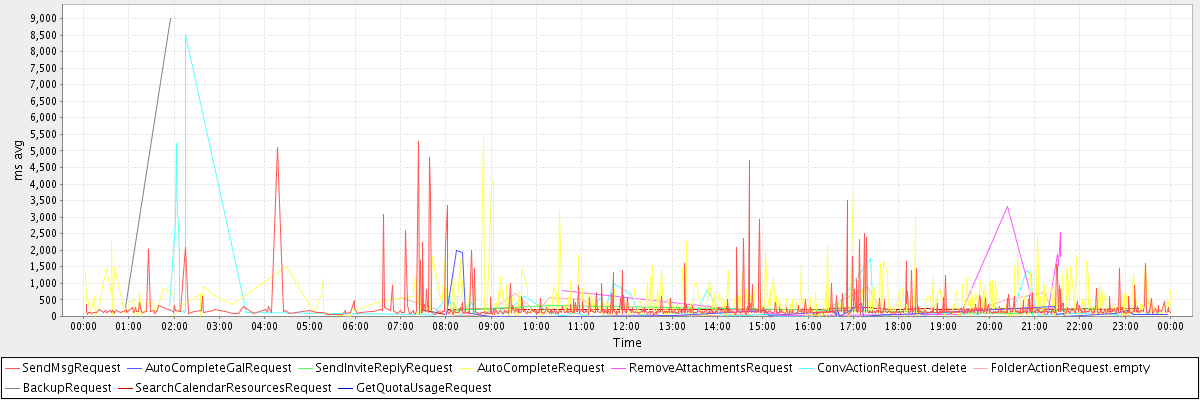 avg(SendMsgRequest) = 256.39 avg(AutoCompleteGalRequest) = 235.15 avg(SendInviteReplyRequest) = 201.75 avg(AutoCompleteRequest) = 440.07 avg(RemoveAttachmentsRequest) = 952.54 avg(ConvActionRequest.delete) = 530.71 avg(FolderActionRequest.empty) = 187.41 avg(BackupRequest) = 4634.50 avg(SearchCalendarResourcesRequest) = 214.05 avg(GetQuotaUsageRequest) = 2440.00