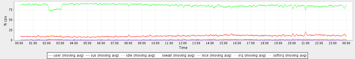 avg(user) = 10.61 avg(sys) = 1.14 avg(idle) = 85.83 avg(iowait) = 2.15 avg(nice) = 0.00 avg(irq) = 0.01 avg(softirq) = 0.26