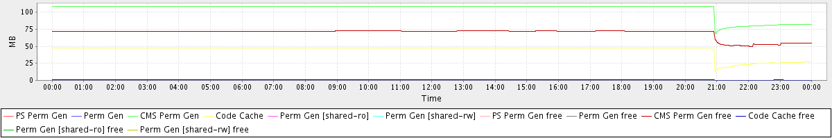 avg(PS Perm Gen) = 0.00 avg(Perm Gen) = 0.00 avg(CMS Perm Gen) = 104.65 avg(Code Cache) = 44.45 avg(Perm Gen [shared-ro]) = 0.00 avg(Perm Gen [shared-rw]) = 0.00 avg(PS Perm Gen free) = 0.00 avg(Perm Gen free) = 0.00 avg(CMS Perm Gen free) = 69.81 avg(Code Cache free) = 0.51 avg(Perm Gen [shared-ro] free) = 0.00 avg(Perm Gen [shared-rw] free) = 0.00
