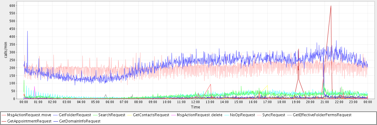 max(MsgActionRequest.move) = 95.00 max(GetFolderRequest) = 436.00 max(SearchRequest) = 120.00 max(GetContactsRequest) = 87.00 max(MsgActionRequest.delete) = 80.00 max(NoOpRequest) = 85.00 max(SyncRequest) = 313.00 max(GetEffectiveFolderPermsRequest) = 72.00 max(GetAppointmentRequest) = 598.00 max(GetDomainInfoRequest) = 263.00