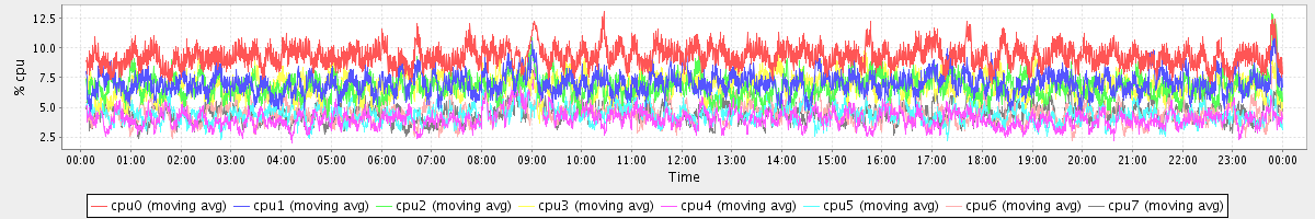 avg(cpu0) = 9.29 avg(cpu1) = 7.04 avg(cpu2) = 6.73 avg(cpu3) = 6.81 avg(cpu4) = 4.06 avg(cpu5) = 4.43 avg(cpu6) = 4.55 avg(cpu7) = 4.53
