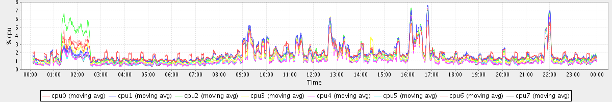 avg(cpu0) = 1.12 avg(cpu1) = 0.23 avg(cpu2) = 0.28 avg(cpu3) = 0.18 avg(cpu4) = 0.14 avg(cpu5) = 0.17 avg(cpu6) = 0.22 avg(cpu7) = 0.16