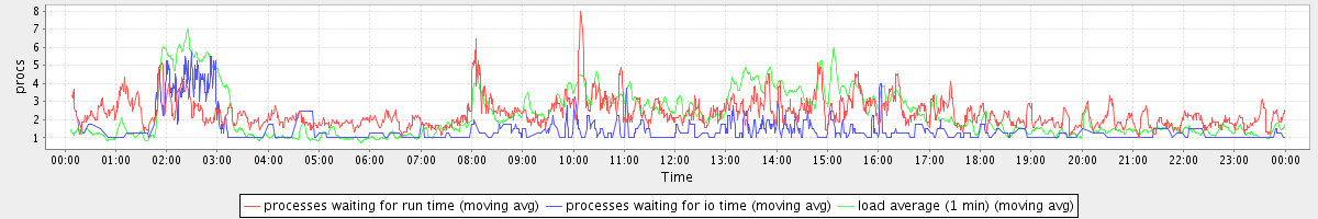 avg(processes waiting for run time) = 1.63 avg(processes waiting for io time) = 0.55 avg(load average (1 min)) = 2.27