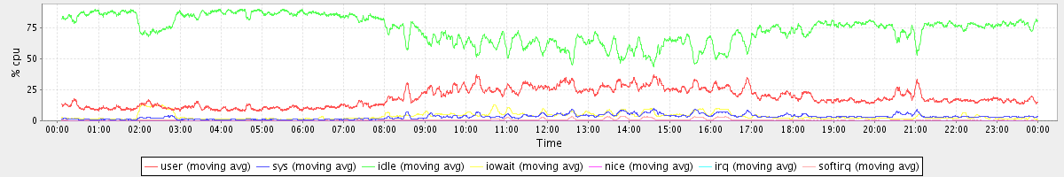 avg(user) = 18.60 avg(sys) = 3.17 avg(idle) = 73.88 avg(iowait) = 3.71 avg(nice) = 0.00 avg(irq) = 0.04 avg(softirq) = 0.60