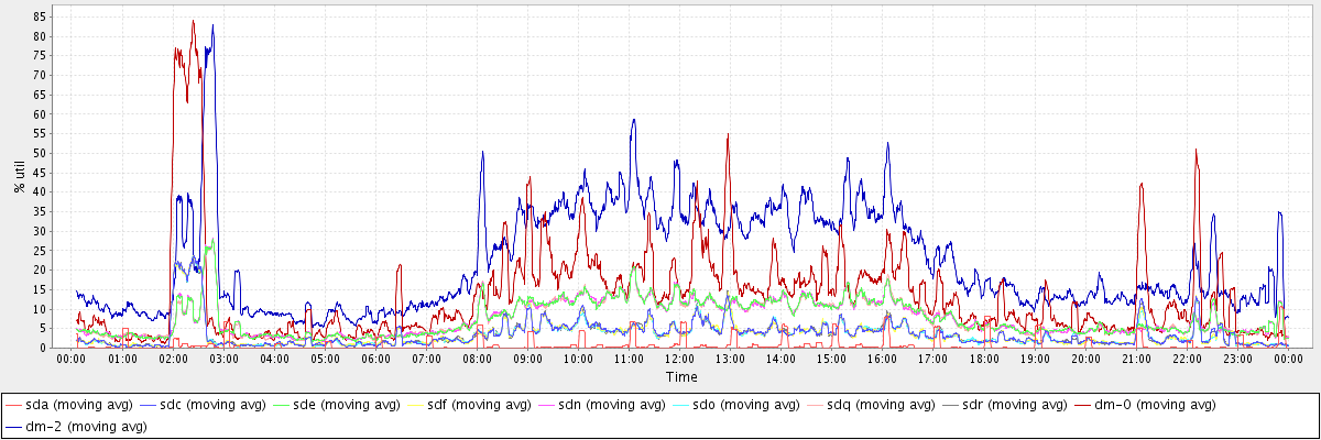 avg(sda) = 0.77 avg(sdc) = 3.65 avg(sde) = 7.58 avg(sdf) = 3.62 avg(sdn) = 7.57 avg(sdo) = 3.56 avg(sdq) = 7.52 avg(sdr) = 3.64 avg(dm-0) = 13.65 avg(dm-2) = 22.15