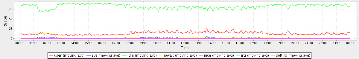 avg(user) = 13.04 avg(sys) = 1.38 avg(idle) = 82.41 avg(iowait) = 2.84 avg(nice) = 0.00 avg(irq) = 0.01 avg(softirq) = 0.31