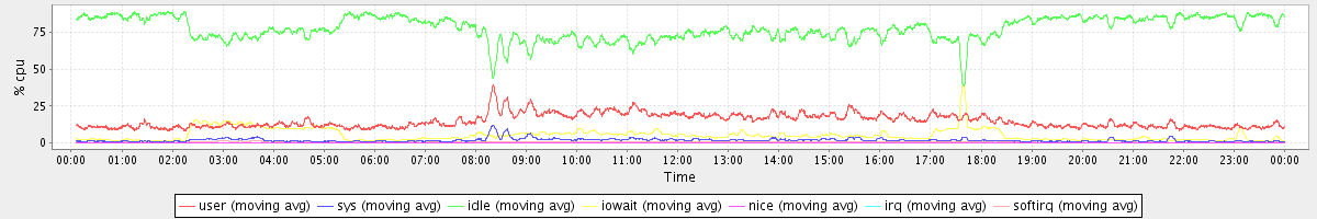 avg(user) = 14.84 avg(sys) = 1.74 avg(idle) = 77.75 avg(iowait) = 5.16 avg(nice) = 0.00 avg(irq) = 0.04 avg(softirq) = 0.47