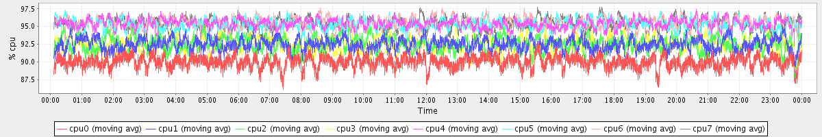 avg(cpu0) = 90.01 avg(cpu1) = 92.48 avg(cpu2) = 92.53 avg(cpu3) = 92.48 avg(cpu4) = 95.34 avg(cpu5) = 95.25 avg(cpu6) = 95.50 avg(cpu7) = 95.43
