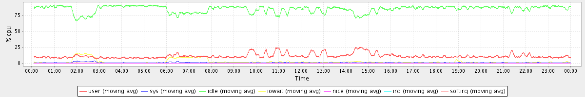 avg(user) = 11.26 avg(sys) = 1.03 avg(idle) = 85.04 avg(iowait) = 2.43 avg(nice) = 0.00 avg(irq) = 0.01 avg(softirq) = 0.24