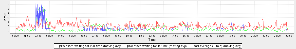 avg(processes waiting for run time) = 1.26 avg(processes waiting for io time) = 0.34 avg(load average (1 min)) = 1.51