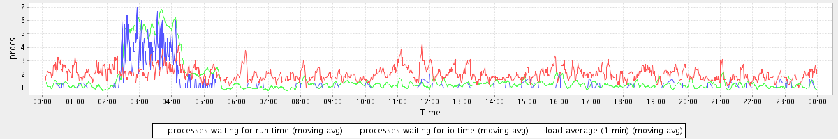 avg(processes waiting for run time) = 1.15 avg(processes waiting for io time) = 0.48 avg(load average (1 min)) = 1.59