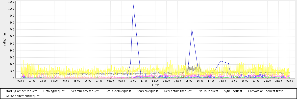 max(ModifyContactRequest) = 76.00 max(GetMsgRequest) = 65.00 max(SearchConvRequest) = 52.00 max(GetFolderRequest) = 261.00 max(SearchRequest) = 150.00 max(GetContactsRequest) = 47.00 max(NoOpRequest) = 192.00 max(SyncRequest) = 319.00 max(ConvActionRequest.trash) = 42.00 max(GetAppointmentRequest) = 1058.00