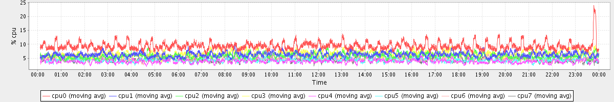 avg(cpu0) = 9.40 avg(cpu1) = 6.27 avg(cpu2) = 5.84 avg(cpu3) = 6.63 avg(cpu4) = 3.90 avg(cpu5) = 4.41 avg(cpu6) = 4.83 avg(cpu7) = 4.51