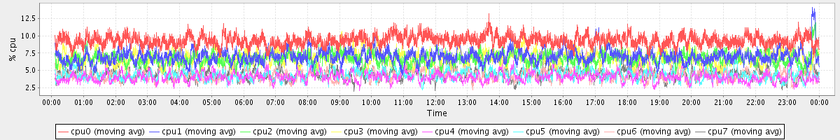 avg(cpu0) = 9.30 avg(cpu1) = 7.00 avg(cpu2) = 6.72 avg(cpu3) = 6.85 avg(cpu4) = 4.03 avg(cpu5) = 4.44 avg(cpu6) = 4.39 avg(cpu7) = 4.46