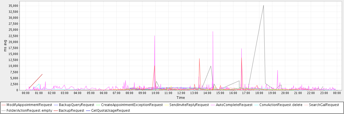 avg(ModifyAppointmentRequest) = 505.36 avg(BackupQueryRequest) = 609.20 avg(CreateAppointmentExceptionRequest) = 376.04 avg(SendInviteReplyRequest) = 456.01 avg(AutoCompleteRequest) = 644.84 avg(ConvActionRequest.delete) = 316.96 avg(SearchGalRequest) = 330.22 avg(FolderActionRequest.empty) = 1756.39 avg(BackupRequest) = 3718.50 avg(GetQuotaUsageRequest) = 2406.00