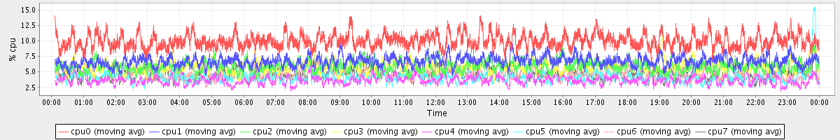 avg(cpu0) = 10.00 avg(cpu1) = 6.73 avg(cpu2) = 5.90 avg(cpu3) = 5.91 avg(cpu4) = 3.68 avg(cpu5) = 4.18 avg(cpu6) = 4.69 avg(cpu7) = 4.67