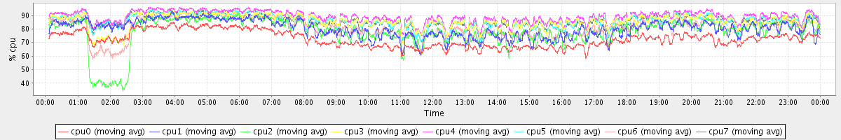avg(cpu0) = 72.48 avg(cpu1) = 80.17 avg(cpu2) = 77.61 avg(cpu3) = 85.46 avg(cpu4) = 88.98 avg(cpu5) = 85.96 avg(cpu6) = 80.54 avg(cpu7) = 85.69