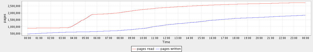 avg(pages read) = 2130916.75 avg(pages written) = 1129312.87