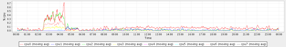avg(cpu0) = 0.08 avg(cpu1) = 0.02 avg(cpu2) = 0.04 avg(cpu3) = 0.01 avg(cpu4) = 0.00 avg(cpu5) = 0.00 avg(cpu6) = 0.02 avg(cpu7) = 0.00