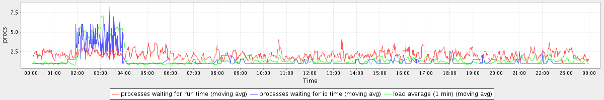 avg(processes waiting for run time) = 1.20 avg(processes waiting for io time) = 0.44 avg(load average (1 min)) = 1.53