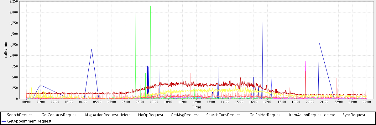 max(SearchRequest) = 644.00 max(GetContactsRequest) = 746.00 max(MsgActionRequest.delete) = 2146.00 max(NoOpRequest) = 305.00 max(GetMsgRequest) = 862.00 max(SearchConvRequest) = 599.00 max(GetFolderRequest) = 595.00 max(ItemActionRequest.delete) = 126.00 max(SyncRequest) = 487.00 max(GetAppointmentRequest) = 1864.00