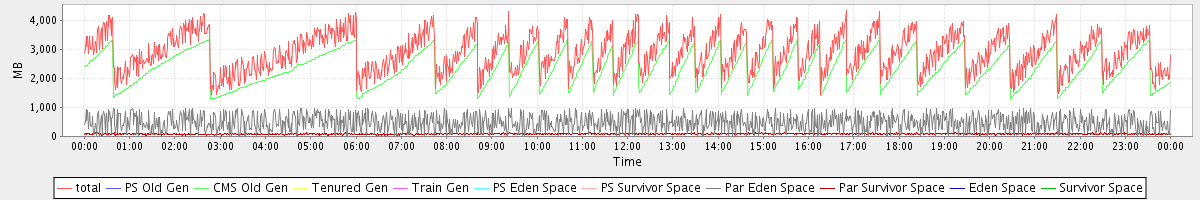 avg(total) = 2896.82 avg(PS Old Gen) = 0.00 avg(CMS Old Gen) = 2328.06 avg(Tenured Gen) = 0.00 avg(Train Gen) = 0.00 avg(PS Eden Space) = 0.00 avg(PS Survivor Space) = 0.00 avg(Par Eden Space) = 483.11 avg(Par Survivor Space) = 85.66 avg(Eden Space) = 0.00 avg(Survivor Space) = 0.00