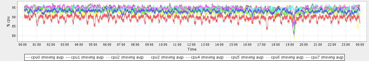 avg(cpu0) = 89.58 avg(cpu1) = 93.08 avg(cpu2) = 93.04 avg(cpu3) = 92.35 avg(cpu4) = 94.33 avg(cpu5) = 94.32 avg(cpu6) = 94.22 avg(cpu7) = 94.84
