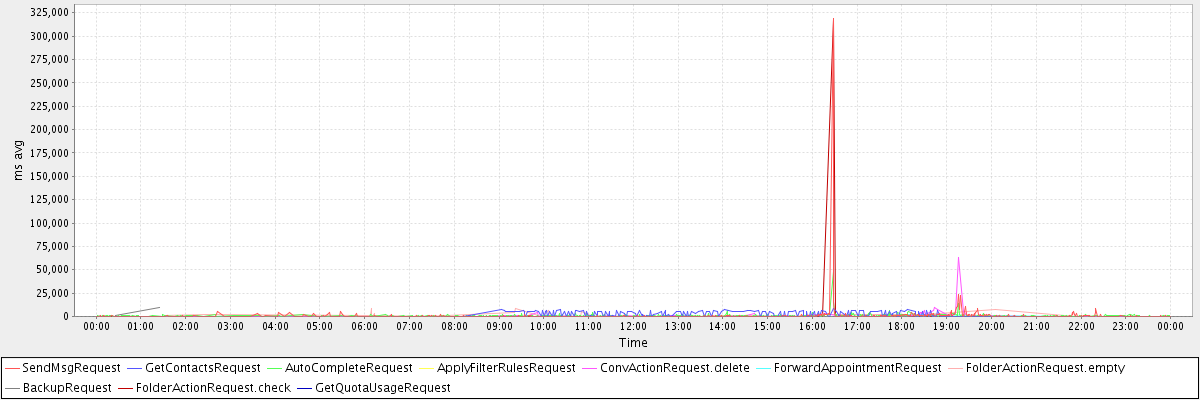 avg(SendMsgRequest) = 872.08 avg(GetContactsRequest) = 2450.76 avg(AutoCompleteRequest) = 832.45 avg(ApplyFilterRulesRequest) = 136624.00 avg(ConvActionRequest.delete) = 2080.32 avg(ForwardAppointmentRequest) = 972.00 avg(FolderActionRequest.empty) = 2037.61 avg(BackupRequest) = 5387.00 avg(FolderActionRequest.check) = 2160.73 avg(GetQuotaUsageRequest) = 1980.00